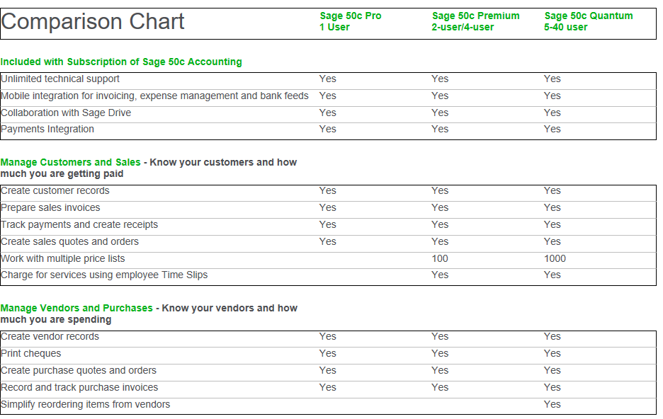 Perbandingan produk Sage 50 Canadian Edition dan ketersediaan fitur
